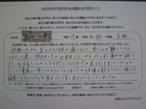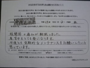 施術の他に毎日自宅でできる体操やストレッチを教えて頂いたことで、これからも今の体調がキープできそうです。ありがとうございました。