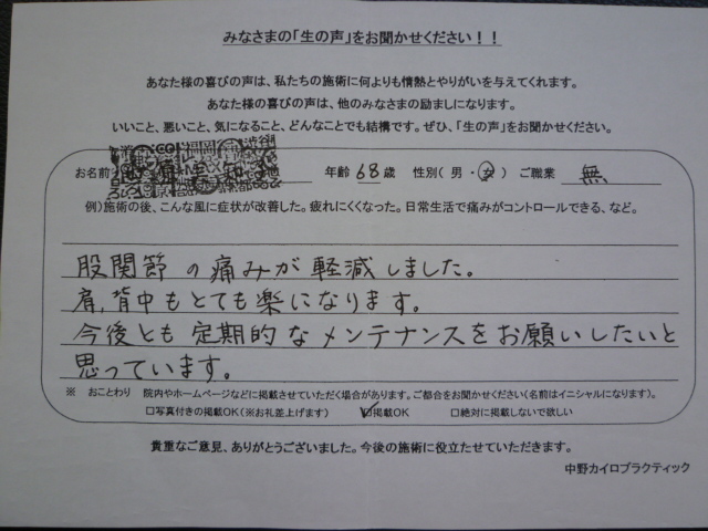 越谷市にお住いのN様(女性/68歳/無職/股関節痛) chat