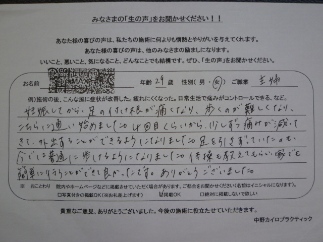 妊娠してから足の付け根が痛くなり、歩くのが難しくなり、こちらに通い始めました。4回目くらいから少しずつ痛みが減ってきて、外出することができるようになりました。足を引きずっていたのも、今では普通に歩けるようになりました。体操も教えてもらい、家でも簡単に行うことができてよかったです。ありがとうございました。