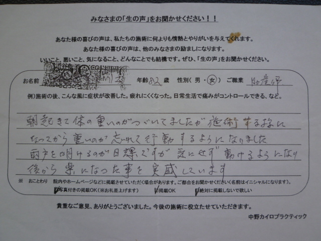 朝起きて体が重いのが続いていましたが、施術をするようになってから重いのが忘れて行動するようになりました。